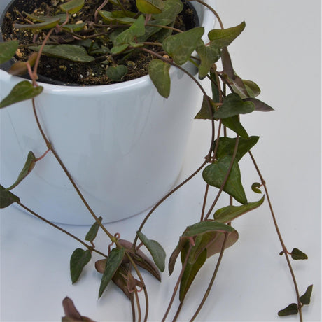 Ceropegia woodii: Ceropegia woodii wird auch String of hearts genannt. Ihre herzförmigen Blätter wachsen an langen Trieben, weswegen sich diese Sukkulente perfekt als Ampelpflanze eignet. Einen Blogartikel über den beliebten Klassiker der Leuchterblumen findest du hier.
