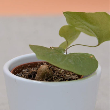 Dioscorea elephantipes: Diese Sukkulente wird im Deutschen auch Elefantenfuß oder Schildkrötenpflanze genannt. Ihr Caudex kann bis zu 1 Meter Durchmesser erreichen. Sie hat rankende grüne Triebe und gelbe Blüten.