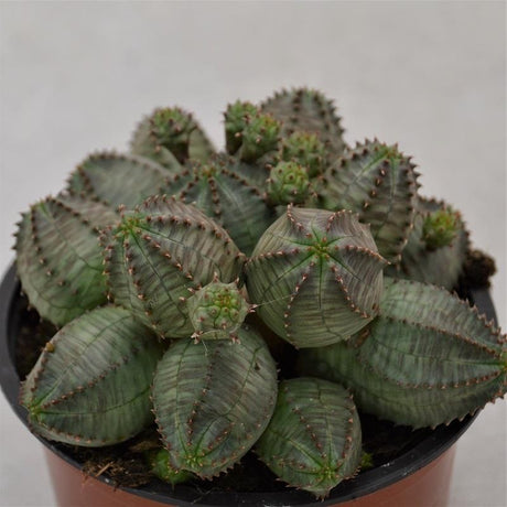 Euphorbia obesa: Diese Pflanze bildet einen kugelförmigen Spross, der nach ein paar Jahren zylinderförmig wird. Sie bildet kleine Dornen und kann eine Wuchshöhe von circa 30 cm erreichen.