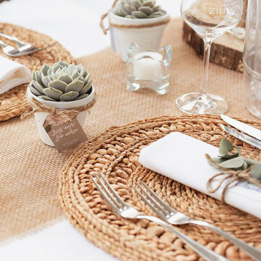 Leicht, frei und voller Natürlichkeit – der Boho-Stil lebt von Makramee, Trockenblumen und Pastelltönen. Sukkulenten sind hier die perfekte Ergänzung: Sie passen in kleine Glasgefäße, in Makramee-Halterungen oder aufwendig dekorierte Tische.