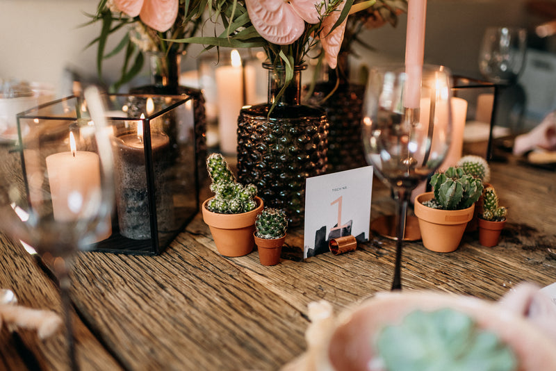 Sukkulenten sind wahre Alleskönner: Sie machen sich nicht nur als Gastgeschenke gut, sondern auch im Brautstrauß, als Haarschmuck oder Teil der Tischdekoration. So werden eure Pflanzen zu echten Hinguckern – und ziehen sich wie ein grüner Faden durch die gesamte Hochzeit.